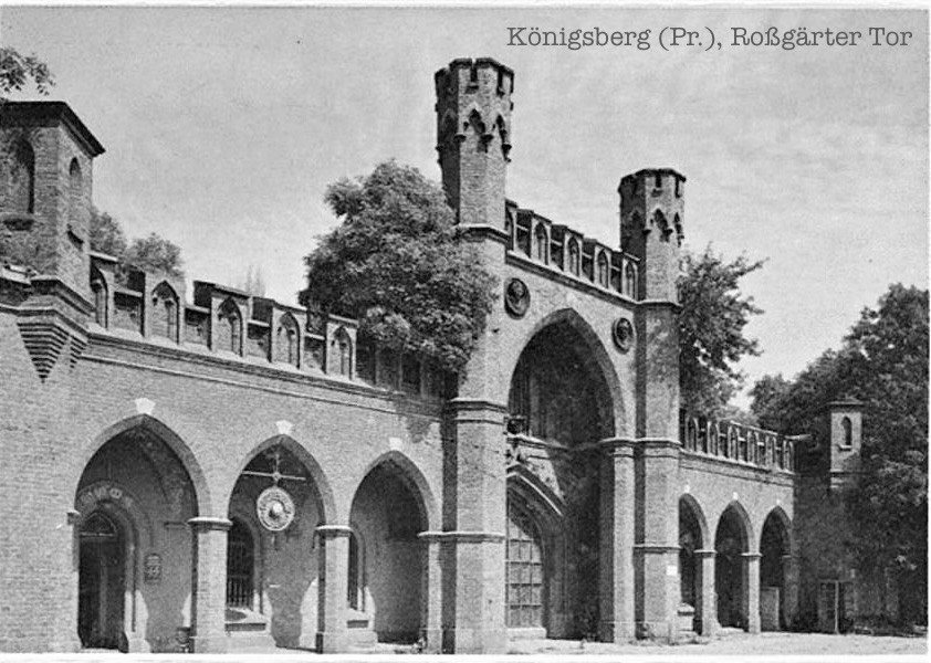 Wohnte man in der Kuplitzer Straße 6a in Alt Roßgarten, im Nord-Osten der Stadt, wie meine Grosseltern, hatte man sozusagen ein Wassergrundstück. Ein paar Schritte über den Hinterroßgarten, am Städtischen Krankenhaus (linkes Bild) vorbei und schon war man da (mittleres Bild) – kaum 200 Meter zu laufen. Hielt man sich am Krankenhaus rechts, erreichte man in wenigen Minuten den Oberteich mit seinen Badeanstalten. Hier, am nördlichen Ende des Hinterroßgarten, befand sich das Roßgärter Tor (rechtes Bild), das für Gerhard zeitlebens das Symbol für seine Identität als Königsberger war. Warum also in die Ferne schweifen … und wärmer war das Wasser sowieso. Und im Winter? Der selbe Weg, nur dass man nicht das Badezeug, sondern die Schlittschuhe dabei hatte.